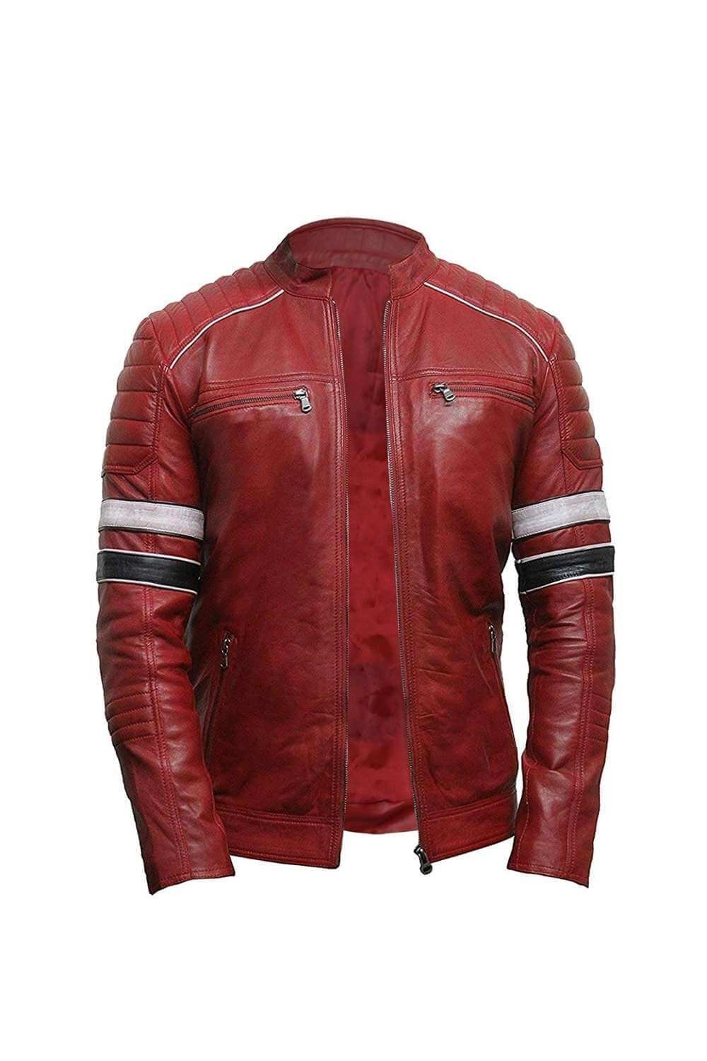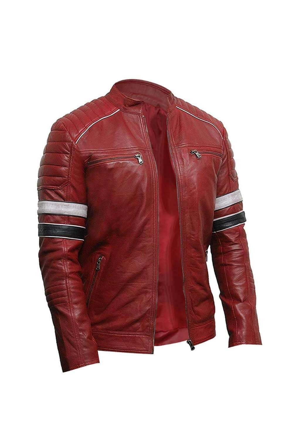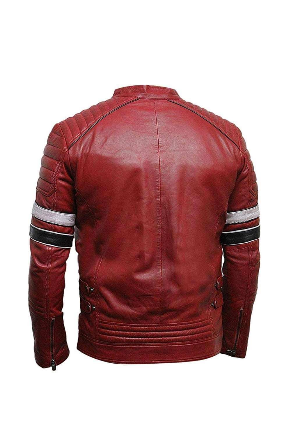 Men’s Retro Cafe Racer Biker Black And White Striped Quilted Red Leather Jacket