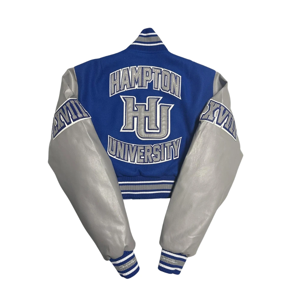 This jacket is designed with intricate features, including triple-layer stitched vegan leather logos and Roman numeral accents on the sleeves. These bold details make the Hampton University Jacket a standout piece in any collection.