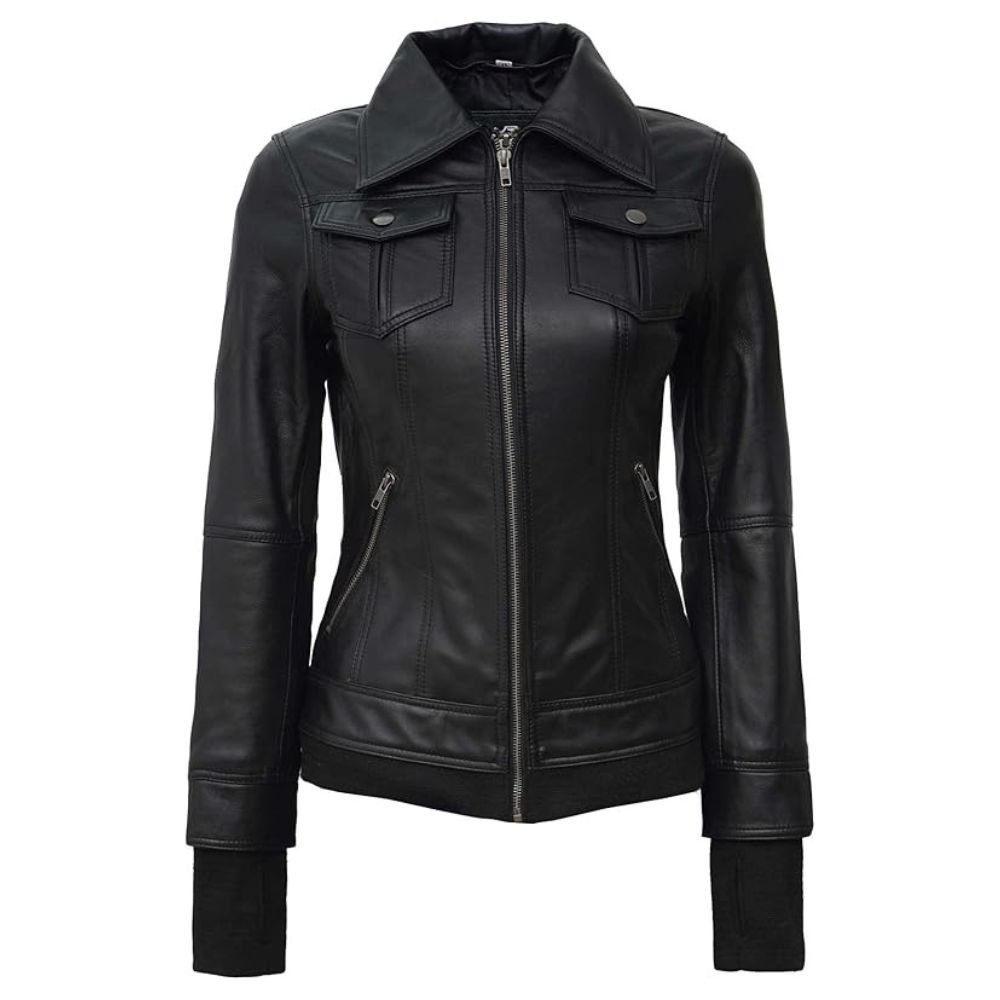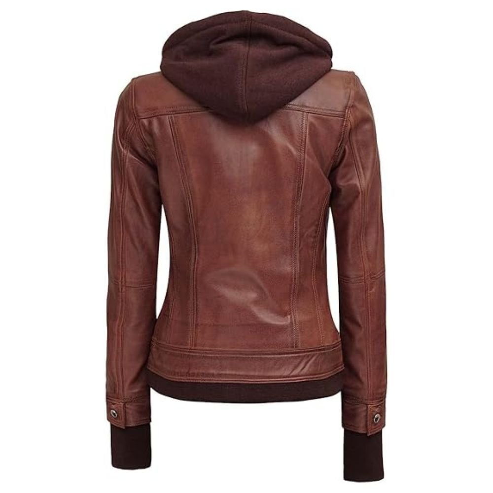 Embrace the perfect balance of comfort and elegance with this Women’s Thumbhole Style Hand Warmer Sleeves Brown Leather Jacket—a must-have for your wardrobe!