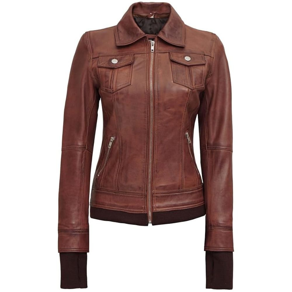 Women’s Thumbhole Style Hand Warmer Sleeves Brown Leather Jacket